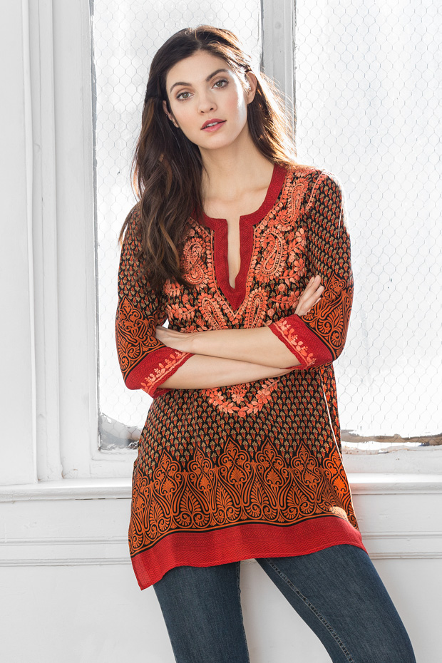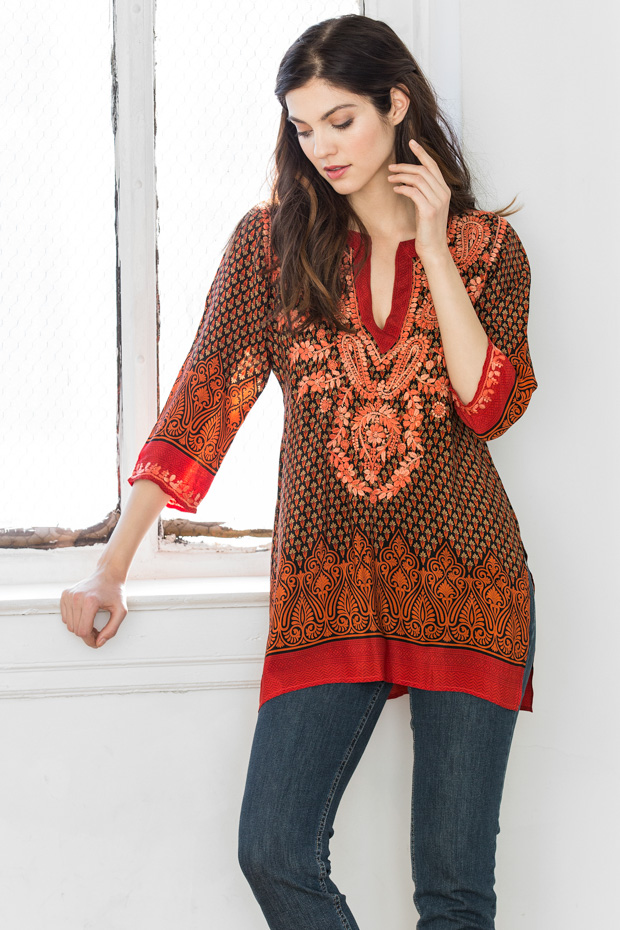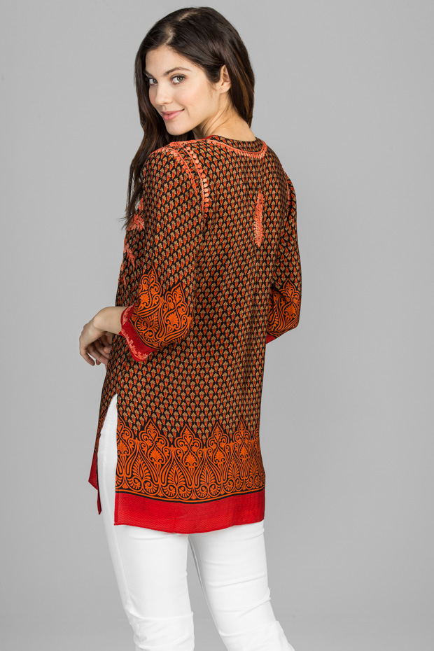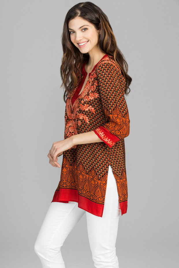 This vibrant silk tunic is absolutely charming with it’s borders and the remarkable detailed hand embroidery. Dynamic yet soft, comfortable and easy to wear. This will make a great impression anywhere, any time.