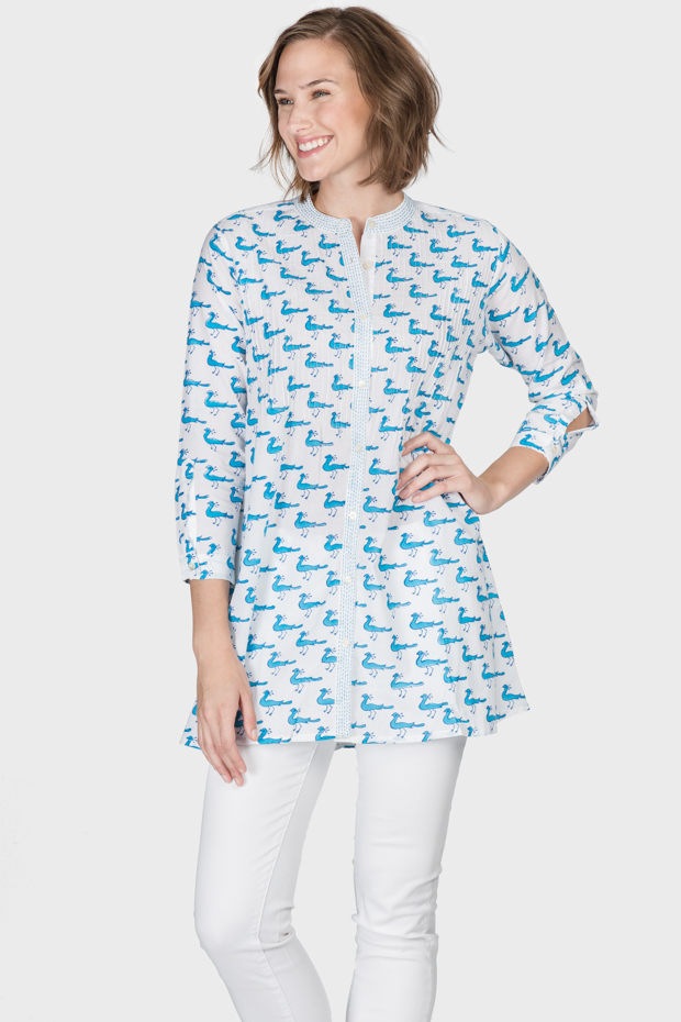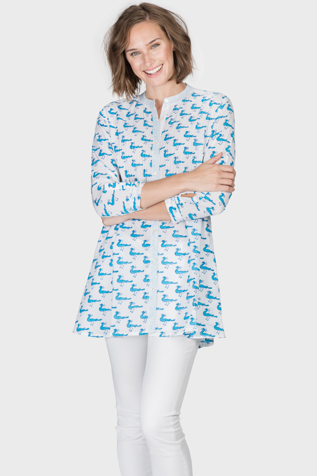 This soft lightweight cotton button front shirt has a lively peacock print.