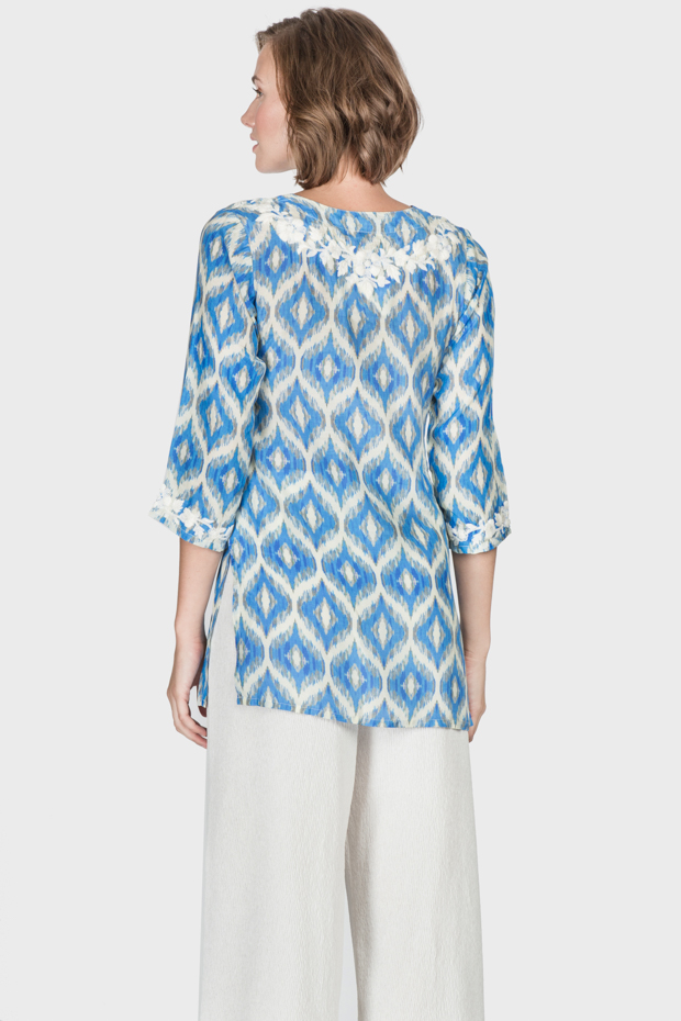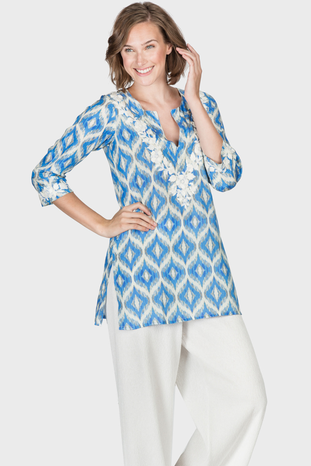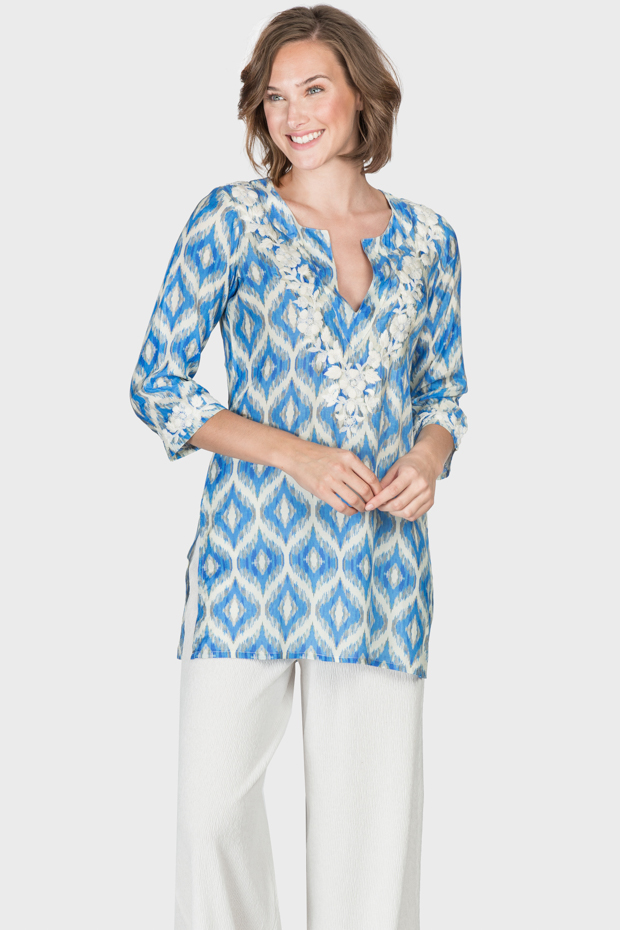 With white hand embroidery along the split neckline and a vibrant color palette, this tunic is effortlessly chic and works well for multiple seasons.