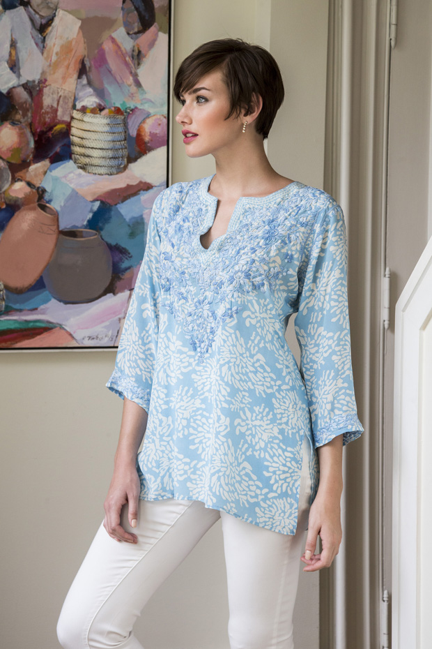 This is an Amaya classic. It is a wonderfully easy shirt to wear any time. The timeless print and the soft colors are flattering and so easy to wear.