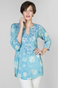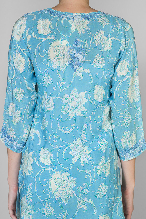 Blue floral silk shirt that will add sophistication to any occasion. Easy to pop over jeans or white pants.