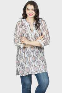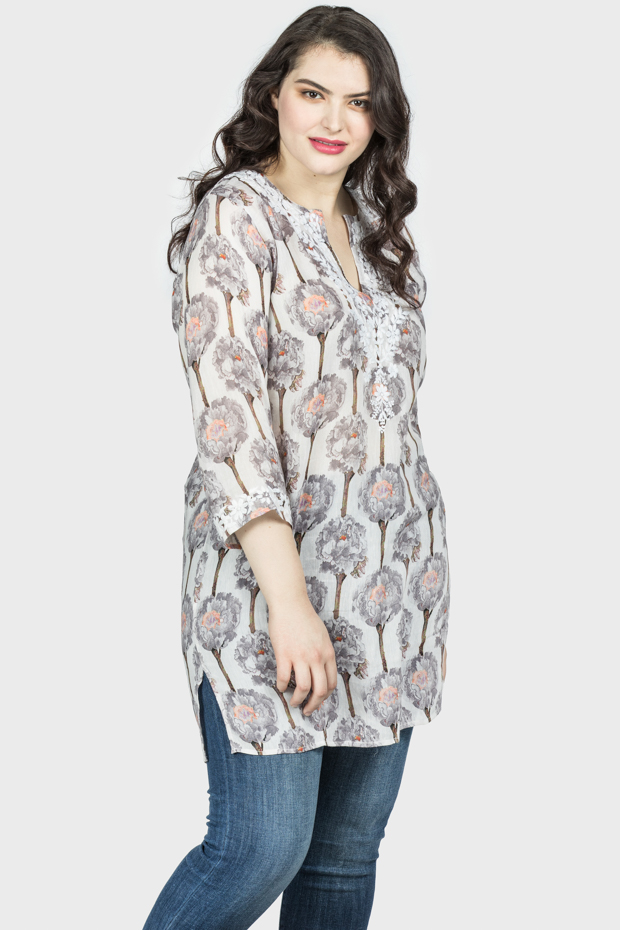 This beautiful gray cotton tunic/dress with contrasting white hand embroidery is sure to make a style statement. It can be worn in multiple ways. Pair it with trousers, leggings or wear as a dress.