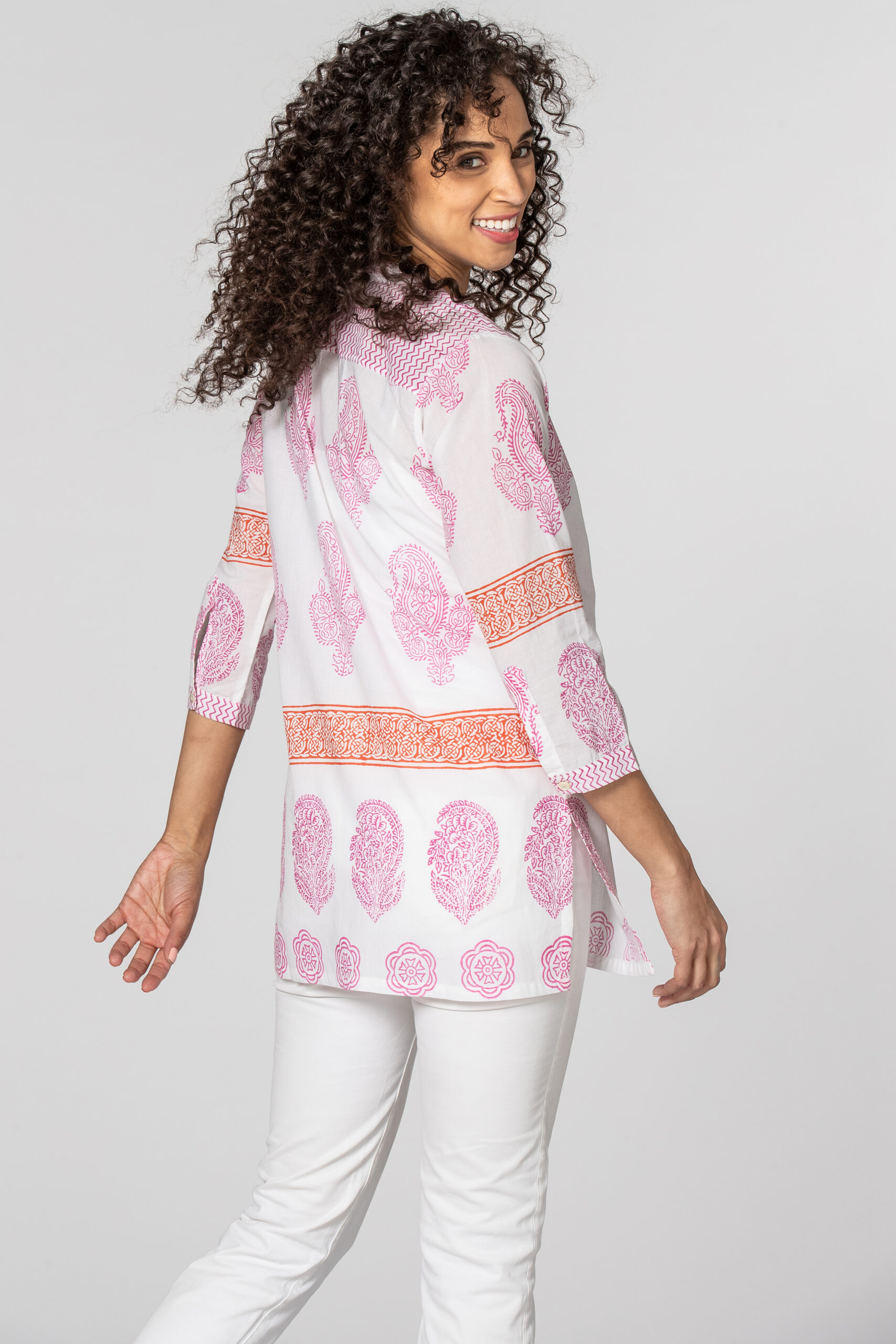 Add some fun and whimsy to your wardrobe with this cheerful cotton shirt. Our Casey Pink top features a flattering neckline with a button front and 3/4 sleeves. Pairs beautifully with white pants, jeans, or shorts.