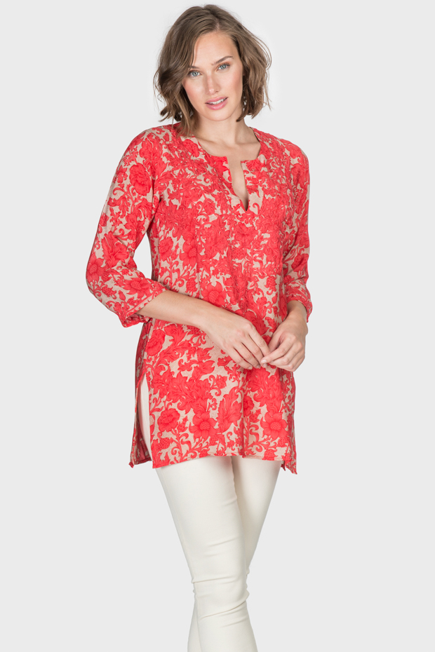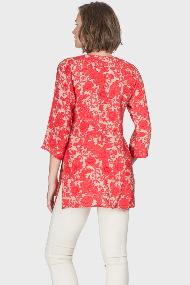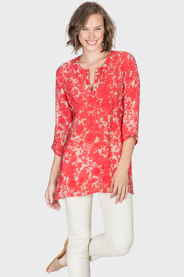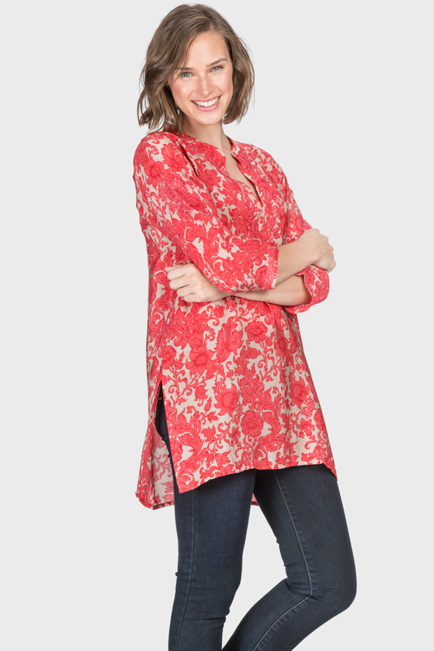 This silk tunic will span the seasons. The vibrant coral color make this a valuable addition to your wardrobe. Wonderful for any occasion and pairs beautifully with jeans or white pants.