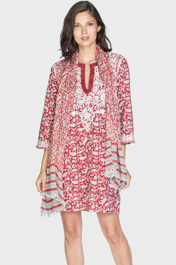 This cotton hand blocked tunic comes in a pretty color palette of red and white and is sure to please. Can be worn in several ways, as a coverup, with leggings, or with skinny jeans. Charlene also comes with a scarf which can also be worn multiple ways.