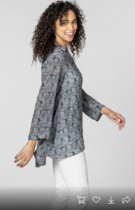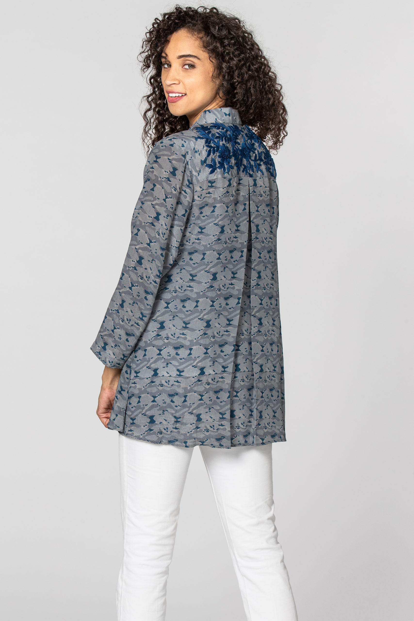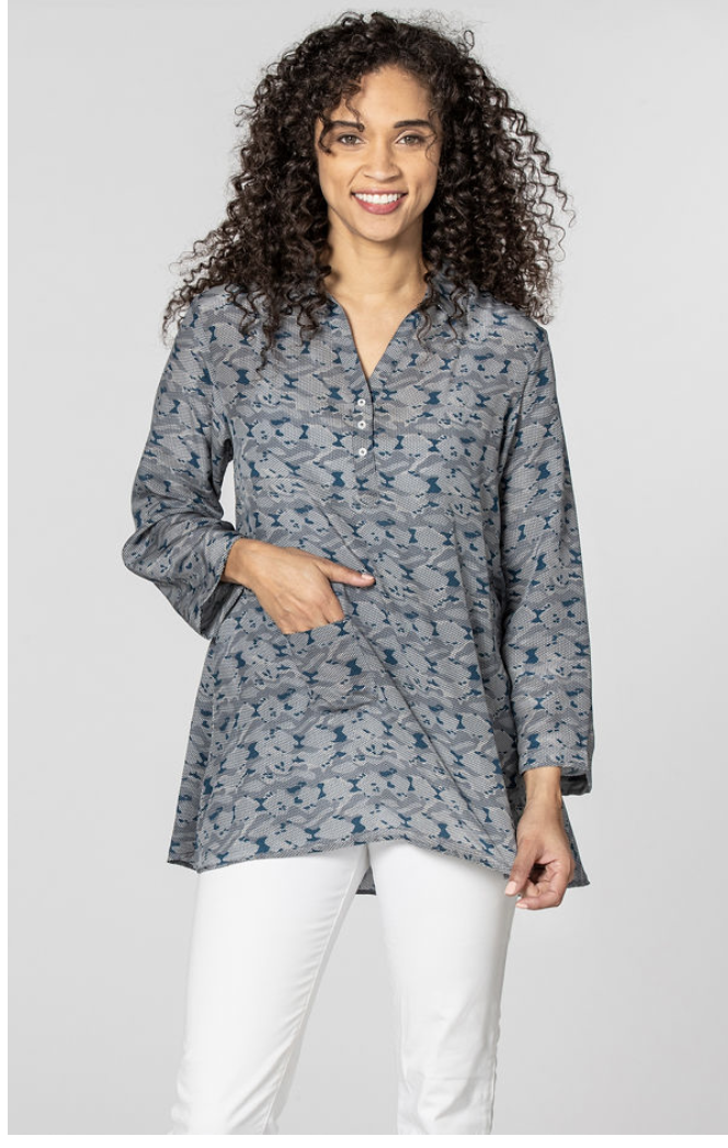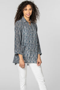 Cora will span the seasons. The lightweight silk crepe has a flattering, relaxed fit. The modern print is enhanced by the old world hand embroidery on the back. The slightly longer length in the back pairs well with leggings or slim pants for a perfect balance.