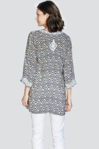 This navy and white silk shirt is a classic. It will never go out of style. Easy to pack and great to wear with jeans or dressed up with white pants and accessories.