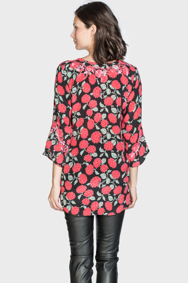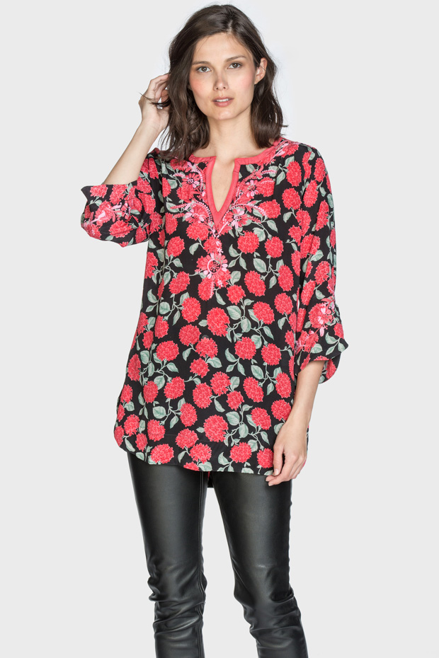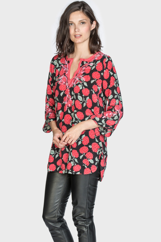 This vibrant floral silk tunic is effortlessly elegant. With its delicate split neckline and hand embroidery, this tunic makes any outfit.