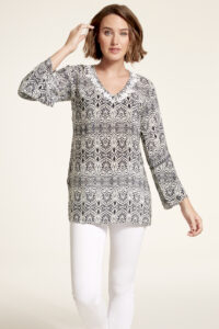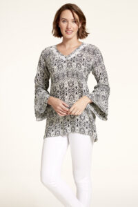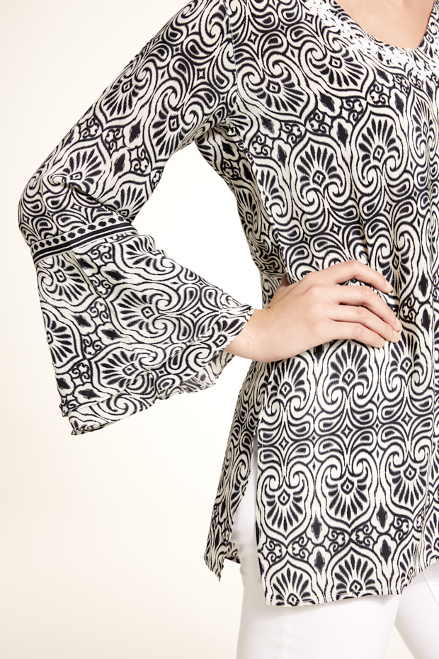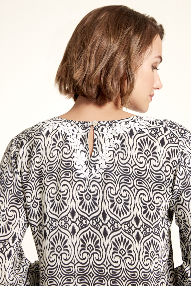 With a classic color combination and stunning hand embroidery, our silk Demi is sure to please. Also features beautiful sleeve detail, and a flattering v neck. Can be dressed up or down for any occasion.