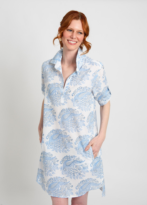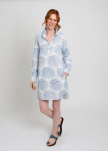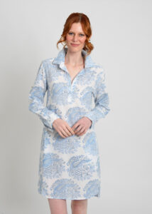 Nothing better than feeling comfy and uncomplicated for a day out. Fresh white and breezy sea blue add softness to this tailored yet feminine dress. Pockets and tabs to hold up the sleeves are added features. For work or play, this dress also loves to travel on holiday.
