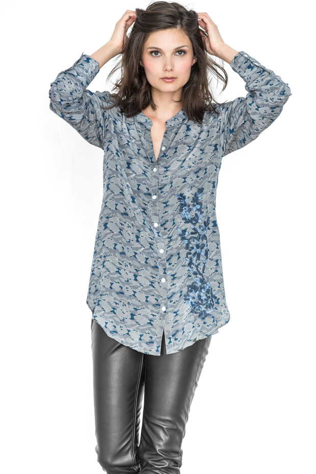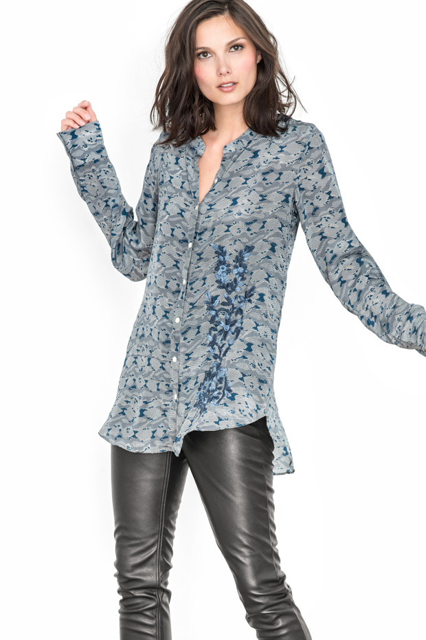 Beautiful silk shirt with longer length to wear tucked in or out. Great choice for day with jeans or out for dinner with your favorite accessories.