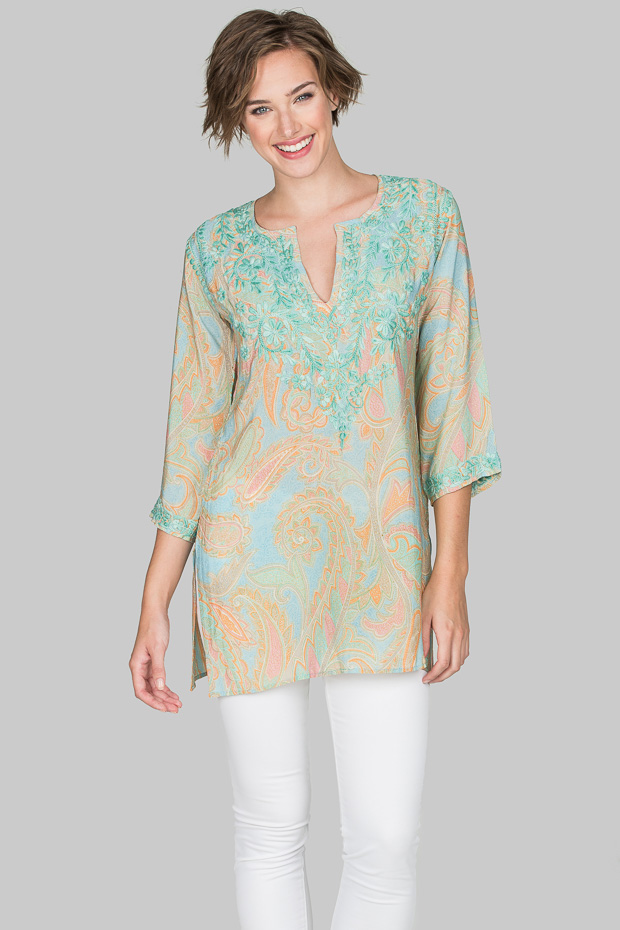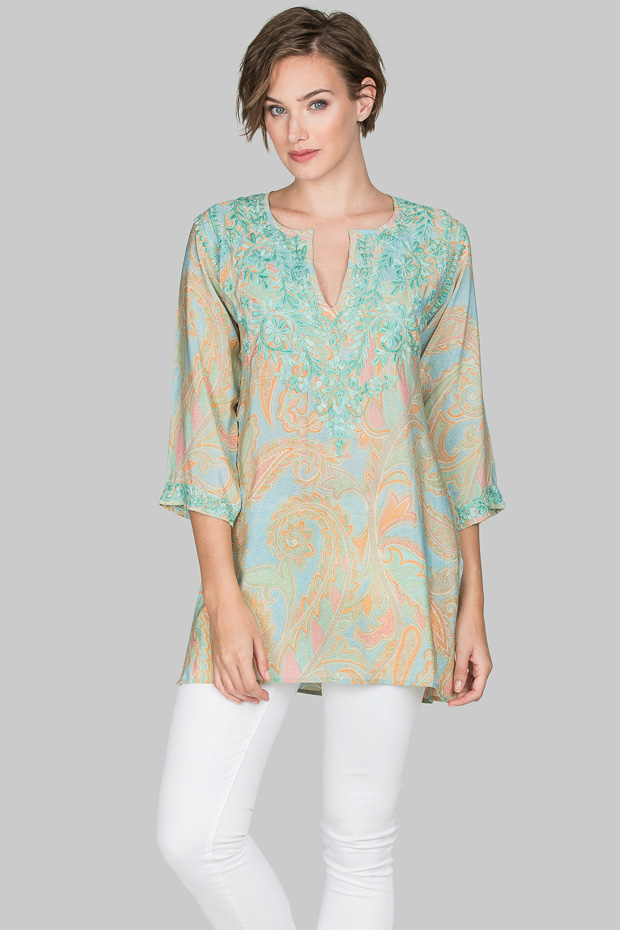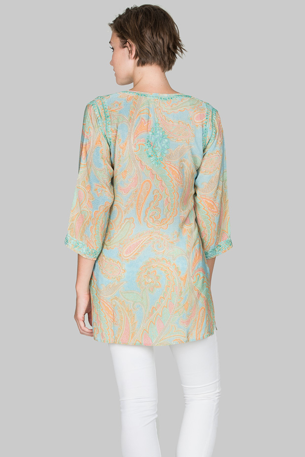 Subtle silk crepe shirt in pastel shades of aqua, beige and green. Understated luxury that is perfect for day or evening. The superb hand embroidery is highlighted on this fine print.