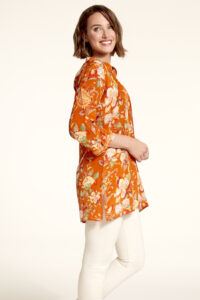 This vibrant silk tunic features 3/4 sleeves and a stunning hand embroidery along the neckline. This will elevate any outfit and can be worn as is or layered with your favorite cardigan or jacket.