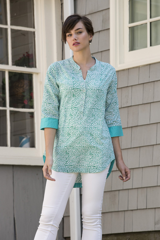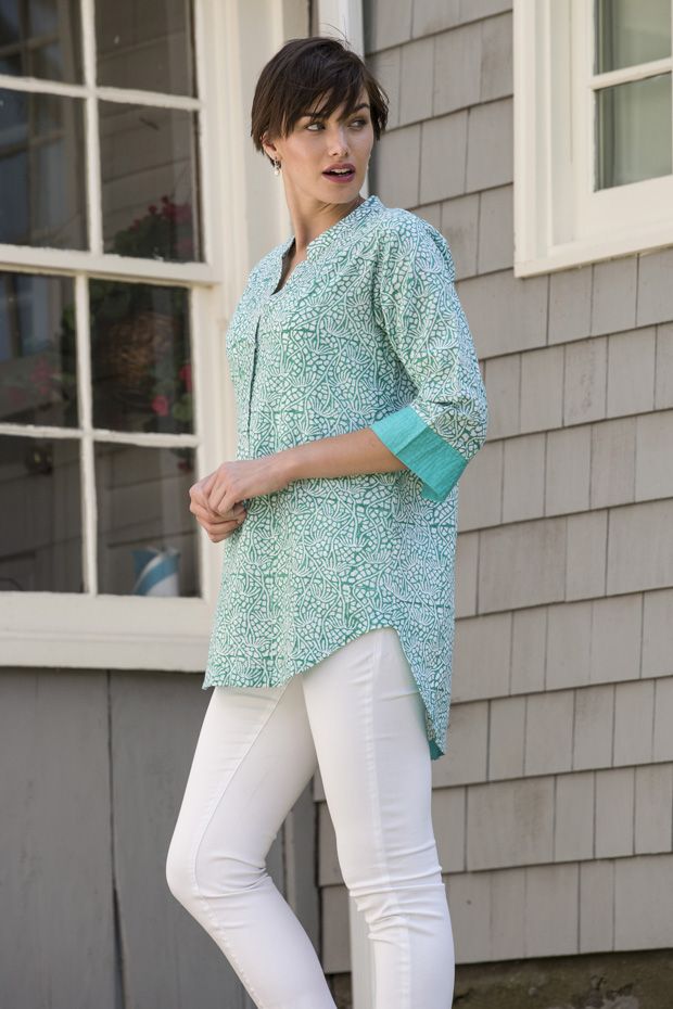 This cotton shirt is perfect for every day casual wear. Features a shorter front hemline and a longer one in the back making it a perfect choice for leggings or skinny trousers.