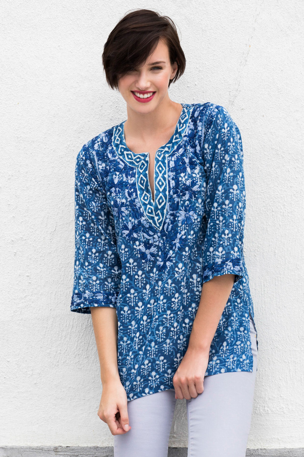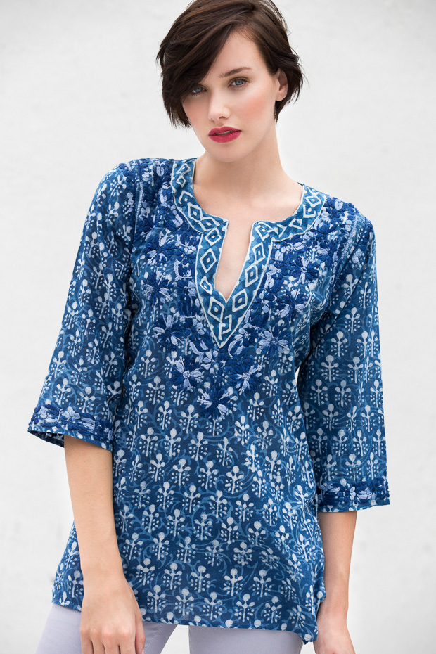 This vivid cotton tunic has a flattering neckline and side slits. In warm weather this light weight cotton breathes making it comfortable and easy to wear. The neckline and sleeves are complemented by our signature hand embroidery. Pairs beautifully with your favorite pants or tucked it into shorts.