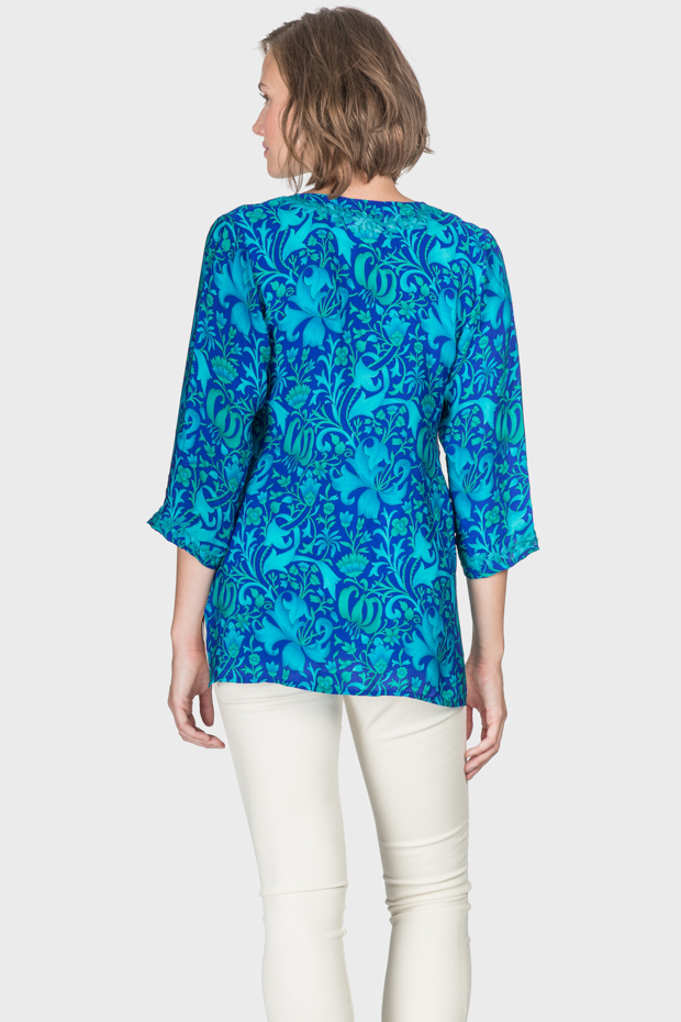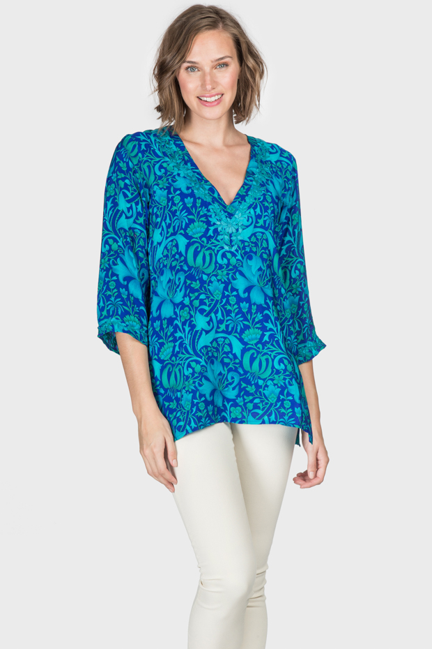 The Harley features a vibrant floral print and hand embroidery along the neckline and cuffs. This stylish silk tunic completes any outfit.