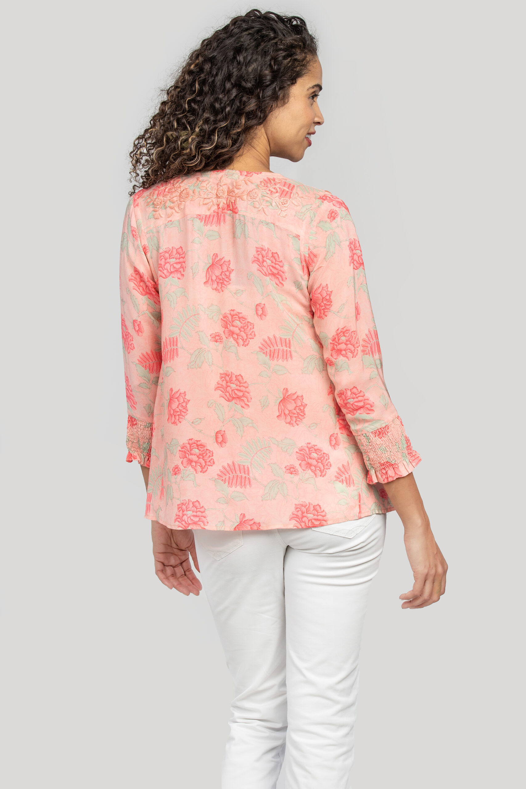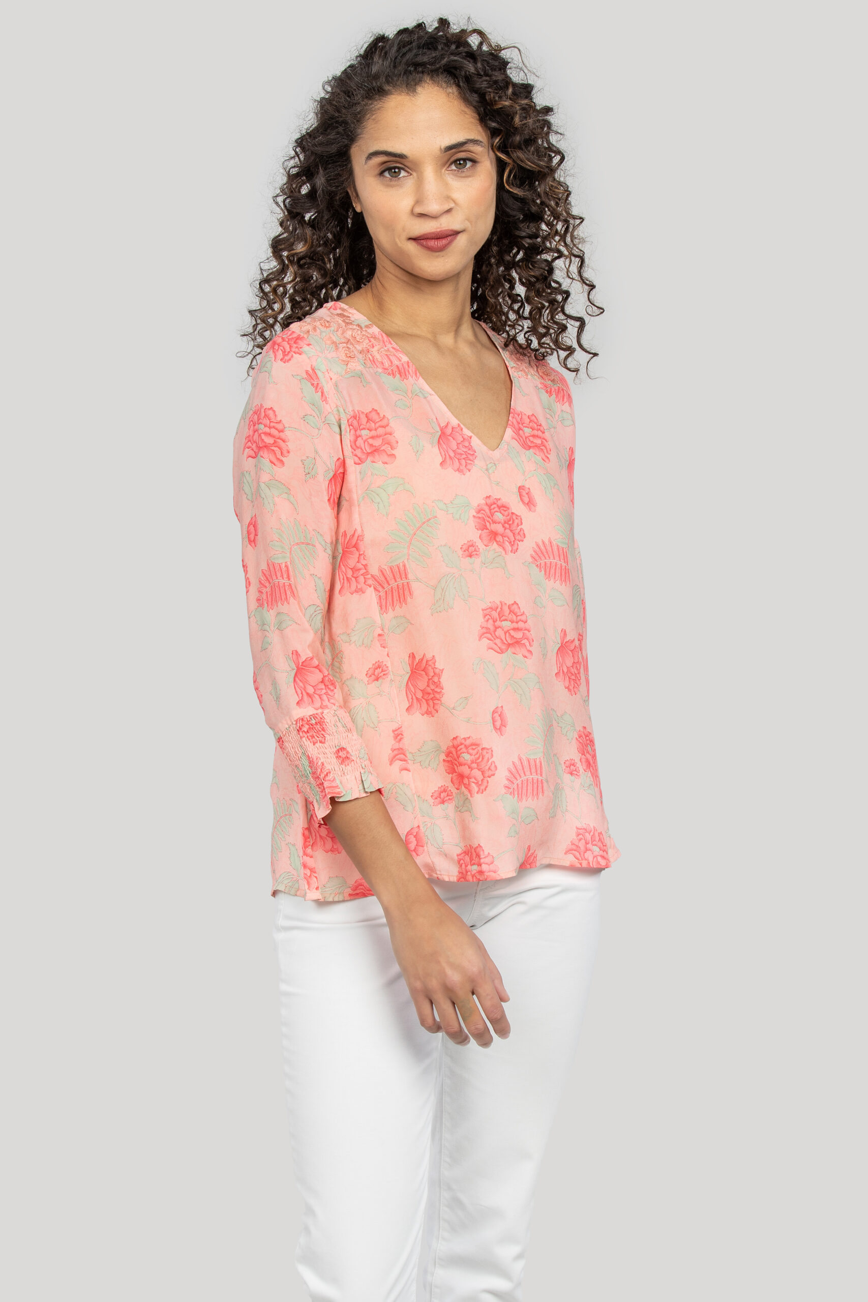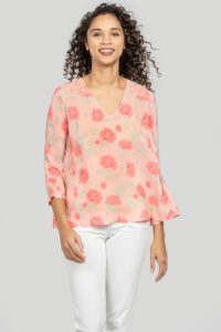 Jana is feminine, cheerful, and comfortable. The flowing body and gathered sleeves make her shine. A flattering V neckline will highlight a favorite necklace. Half-tuck yours into slim jeans for a relaxed take.