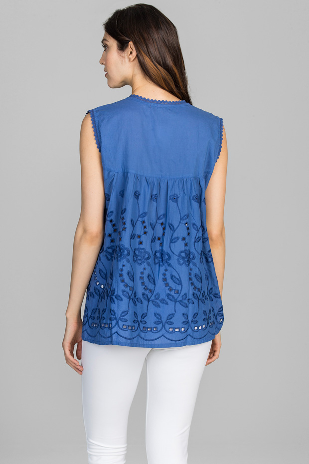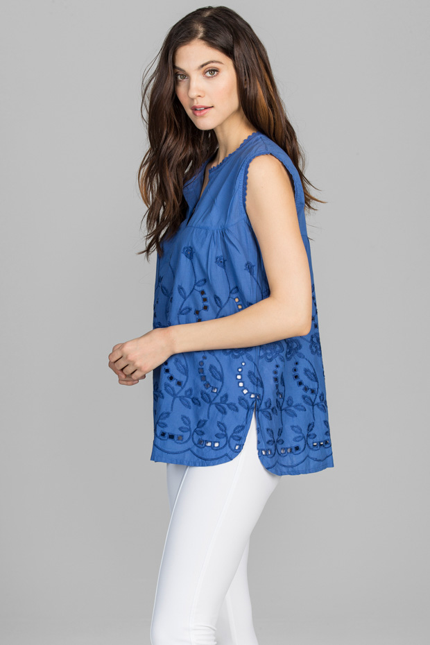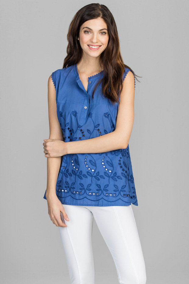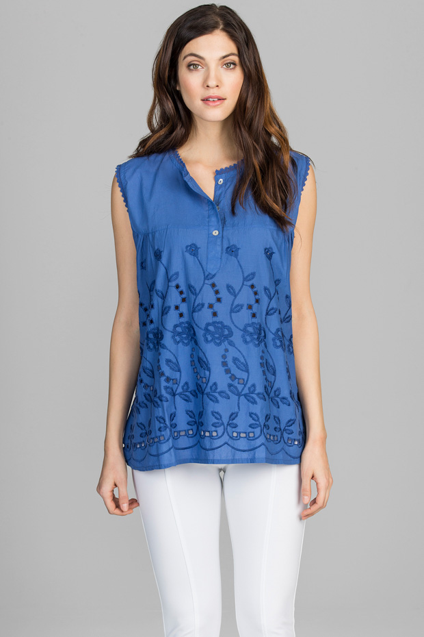 Here comes summer! This organic cotton shirt features a striking eyelet design and is perfect for any warm weather occasion. Beautiful, comfortable and easy to wear.