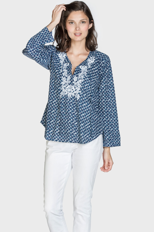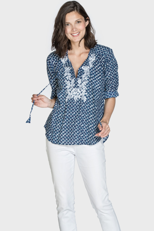This classic cotton top is sure to please. Features hand embroidery and tassels