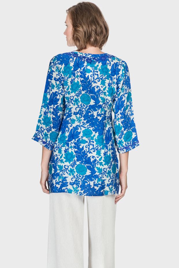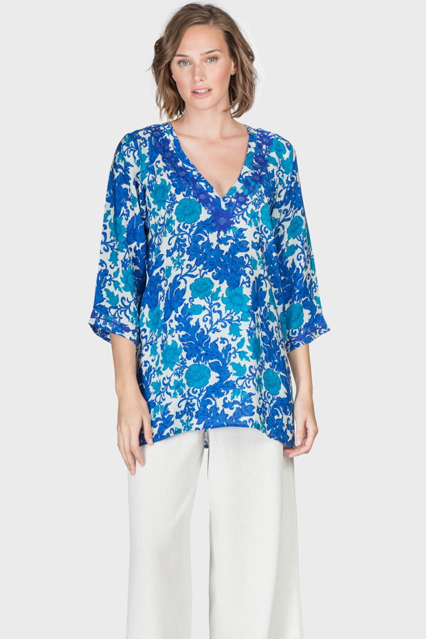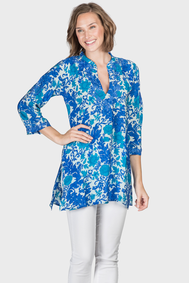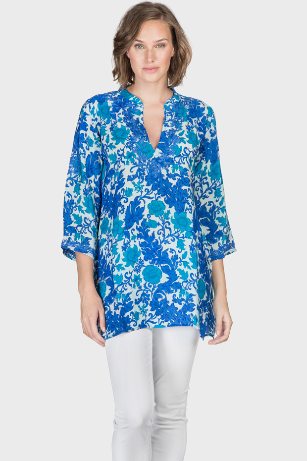 This floral silk tunic is pure elegance. The invigorating color palette and bold design stand out. A complimentary neckline and relaxed make it easy to wear.  All you need are earrings.