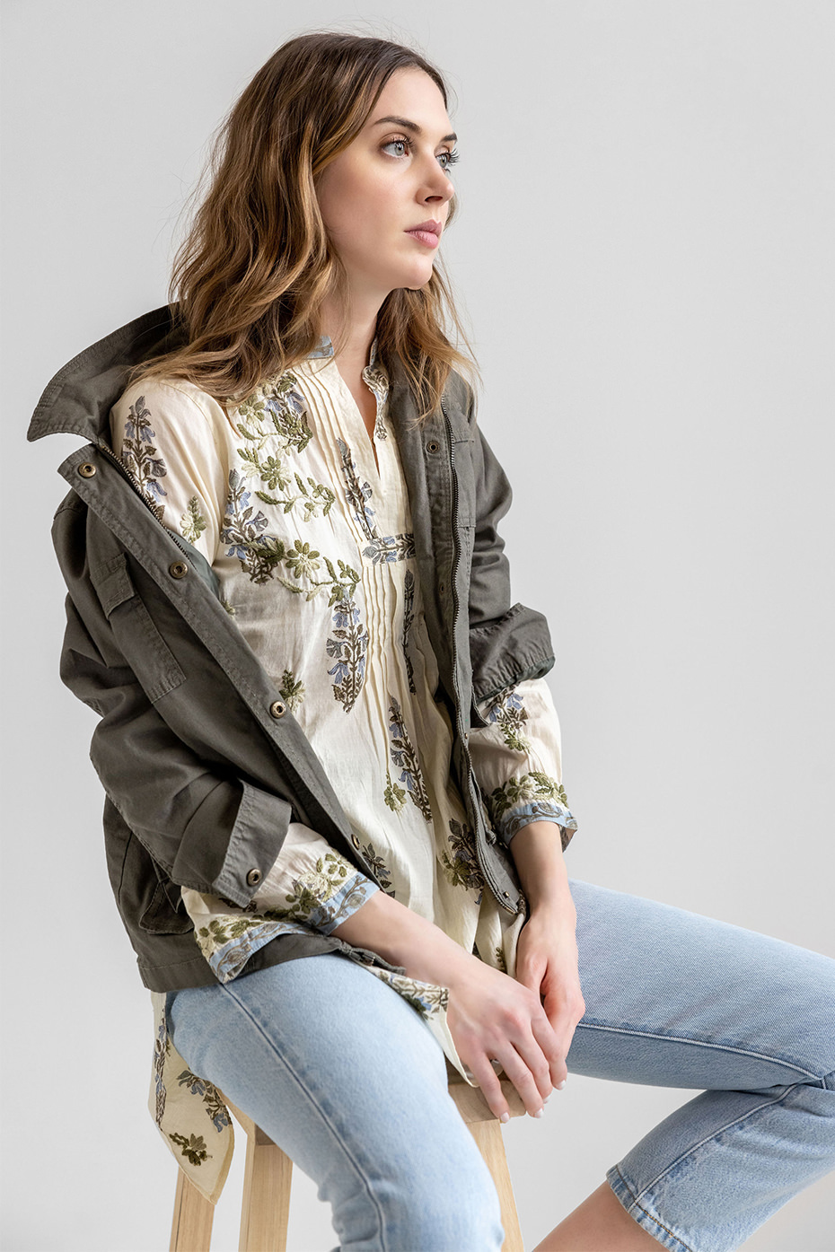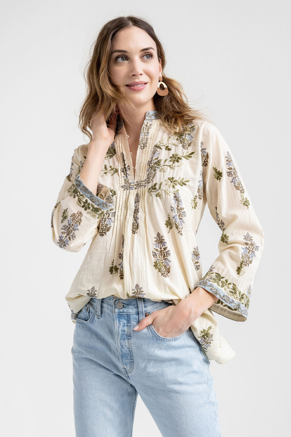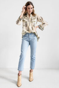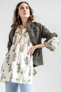 The Kirby is light weight cotton in a relaxed fit. It’s versatile, worn as a top with jeans tucked in or just loose. It’s also a mini dress. Pleated, button front details and hand embroidery create a look that is both casual and effortless. Boots, sandals or heels pair well.