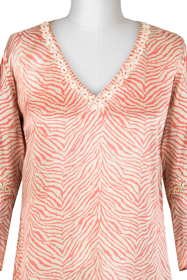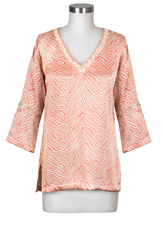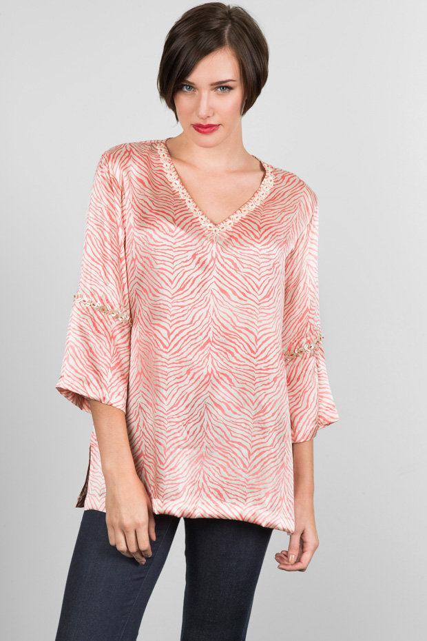 This feminine and stylish top is made of luxurious silk satin. Mother of pearl buttons are hand applied around the neck and the sleeves The v-neck is flattering and the shape is easy to wear.