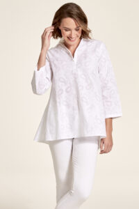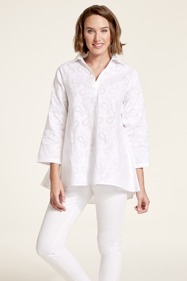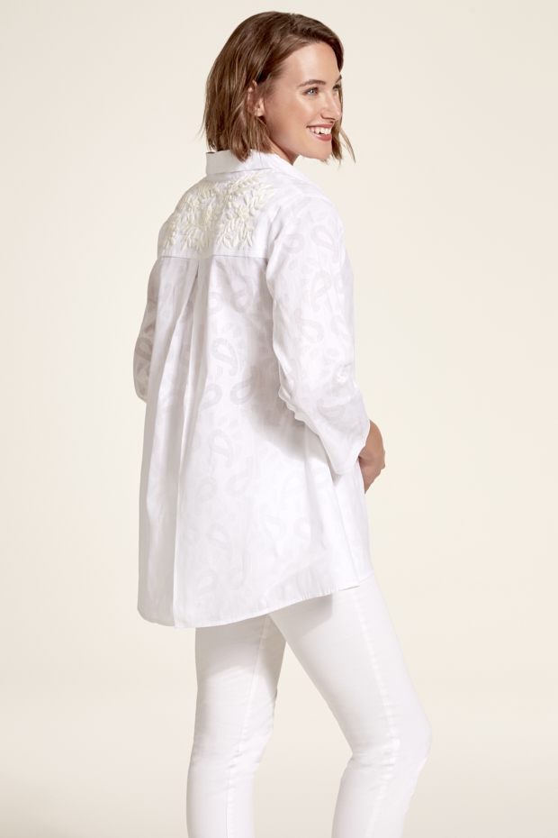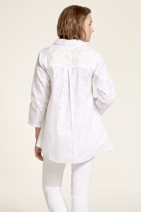 Effortlessly chic, this not so basic white tunic has beautiful hand embroidery on the back, a low- high hemline and 3/4 sleeves. Pairs wonderfully with your favorite pants.