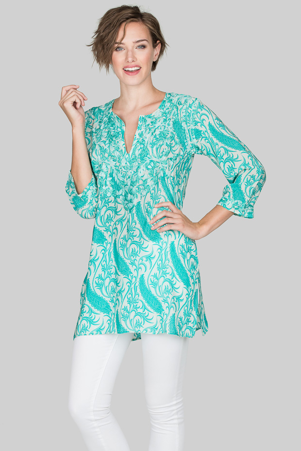 Soft rich silk crepe shirt in turquoise green, the colors of the Caribbean sea. Graceful and flowing for effortless dressing, day or evening.