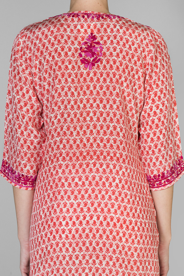 Make a style statement with this vibrantly hued silk tunic. The small paisley print is a classic. Hand embroidery around the neckline is an added special touch. It’s perfect with white pants and flats for an ideal daytime look or with drop earrings for evening. It can also update your favorite jeans.