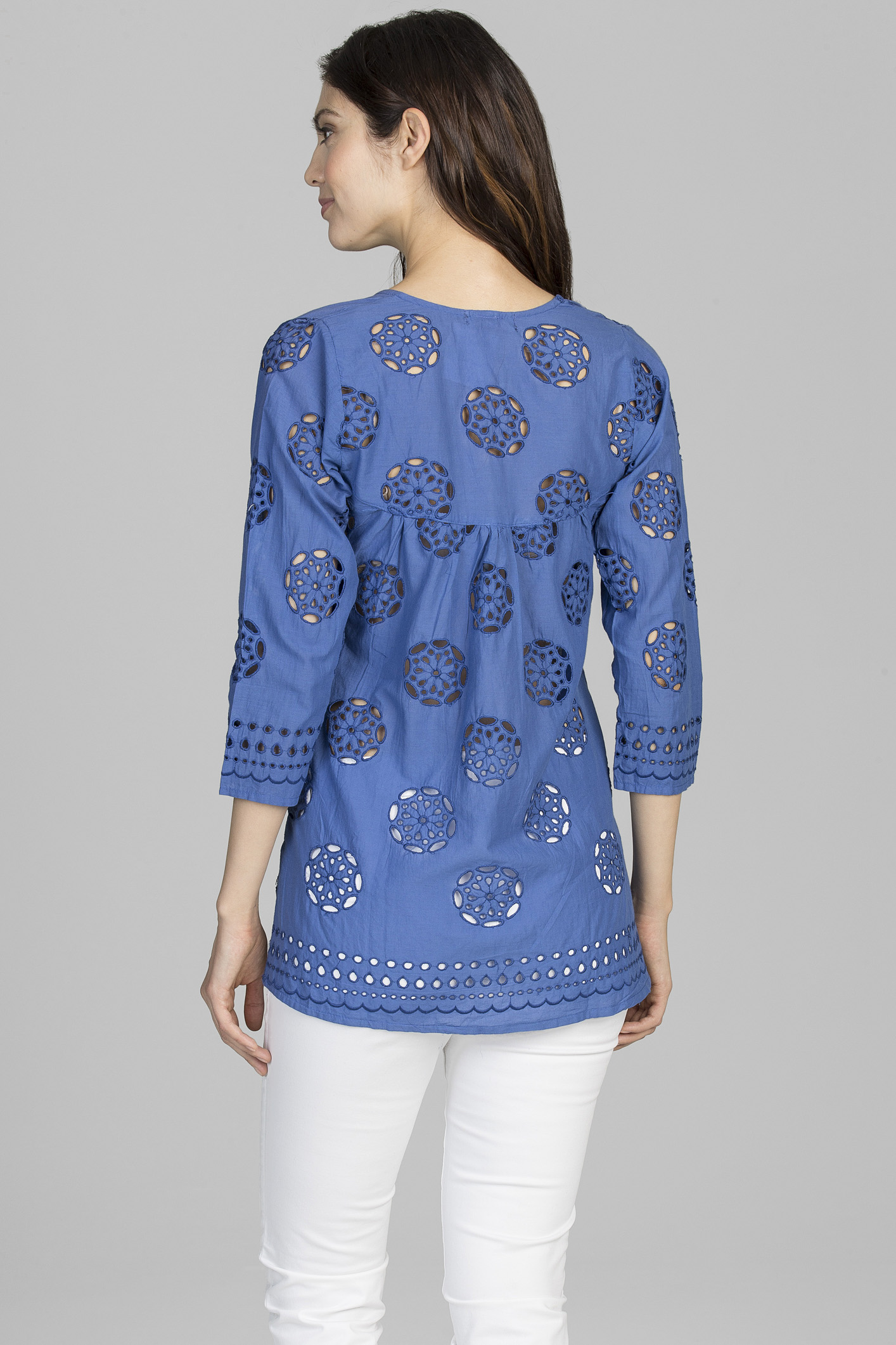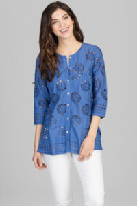 Meet Maria. This eyelet cotton is soft and cool. The button front makes it simple to wear as a shirt or as a light weight jacket over a camisole. Maria is an easy staple for a summer wardrobe.