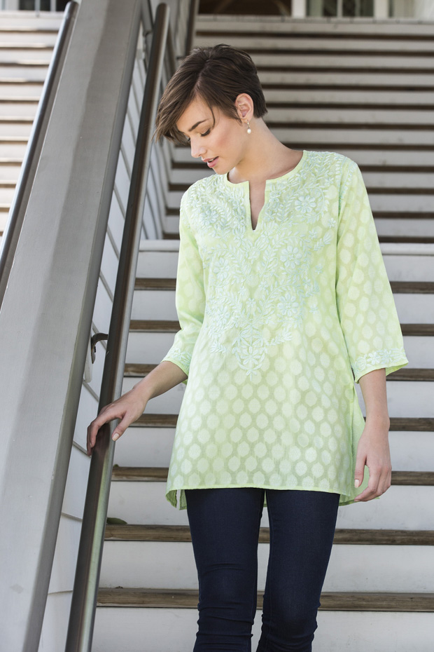 This cotton damask tunic features stunning hand embroidery and 3/4 sleeves. The lively green is a great color for sunny days. Pairs beautifully with leggings, jeans or white pants.