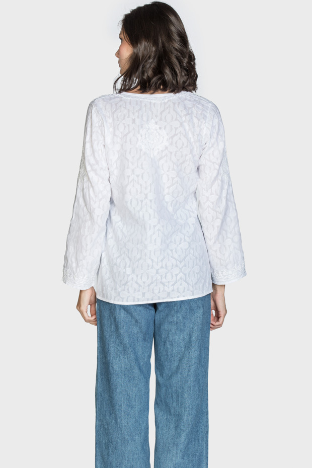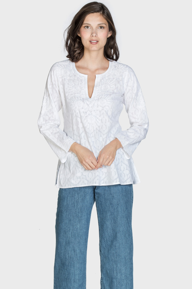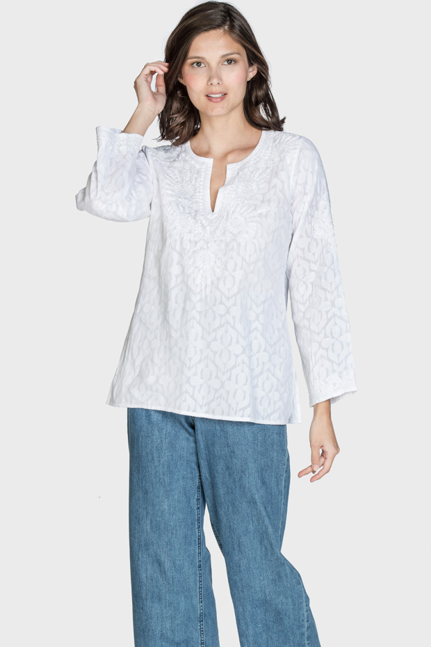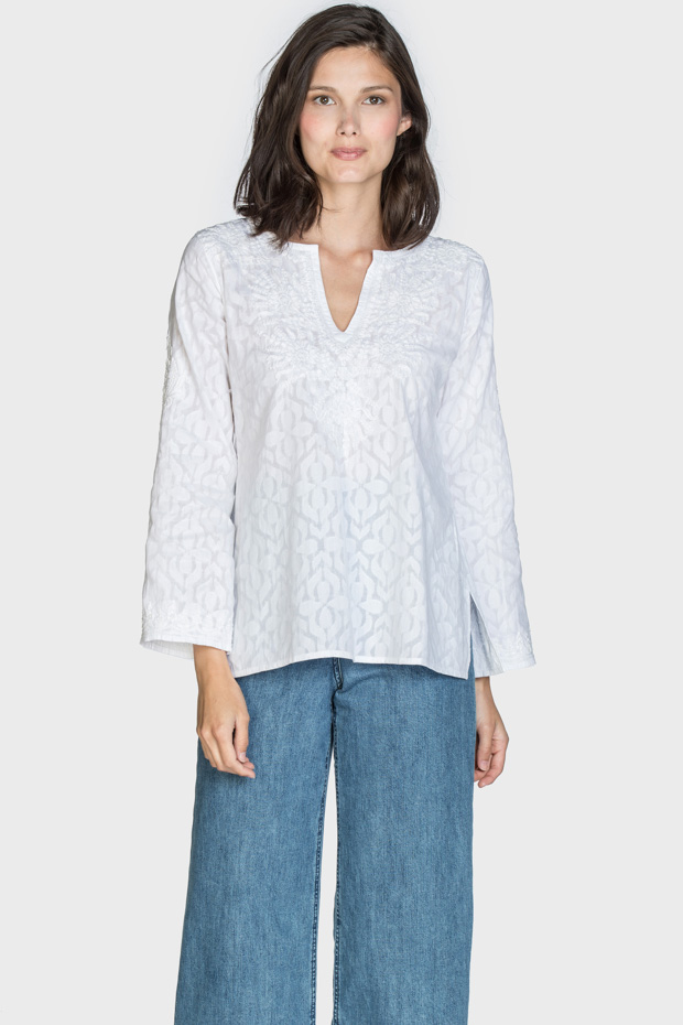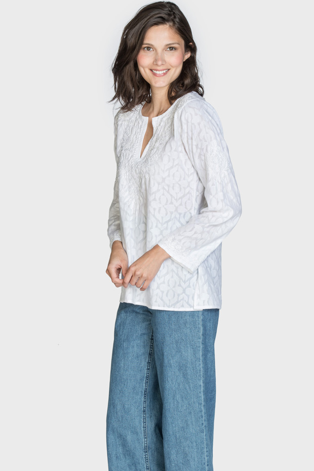 Every wardrobe needs a great white shirt and this cotton hand embroidered tunic is the perfect mix of pretty and practical. Will look great with any of your favorite pants.