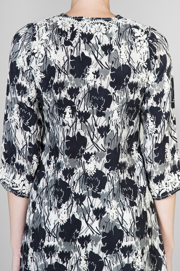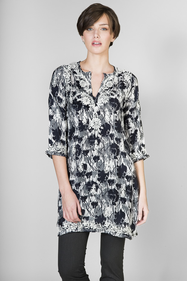 This draped silk dress has a classic color combination and a unique floral print.   The simple shape is flattering and comfortable.  A stunning dress/tunic featuring delicate hand embroidery on the neckline and the hem. It’s a classic for all times.