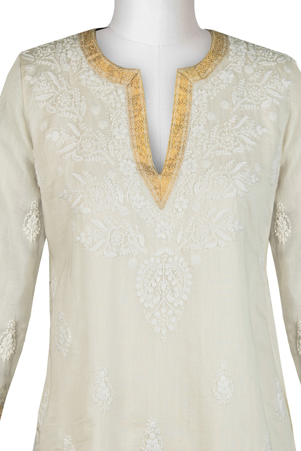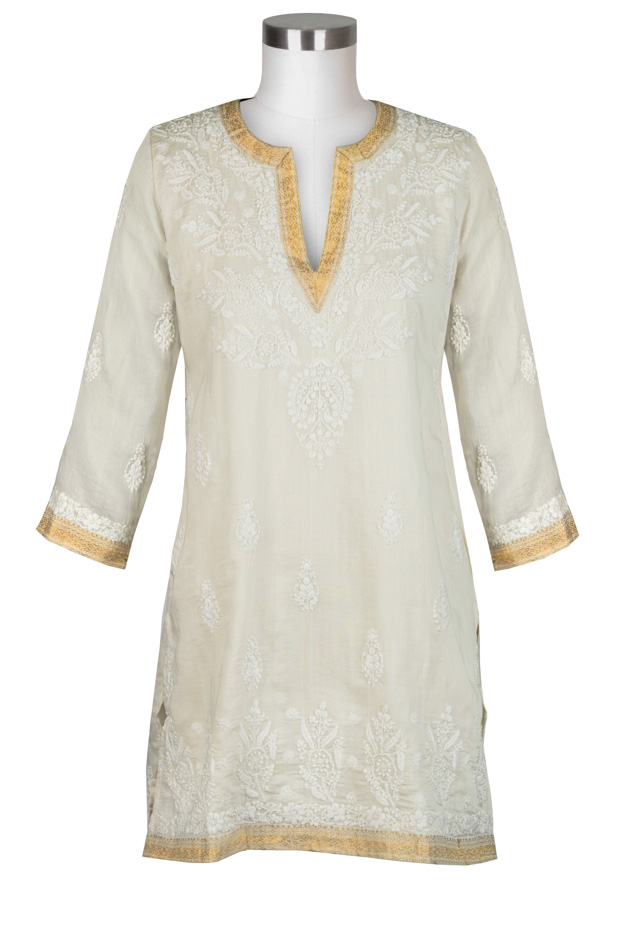 This exquisite tunic is made from hand woven silk and is available in 2 lengths: mid-thigh (31″) and knee length (35″). It has a stunning gold border. The magnificent embroidery is done by hand. Stylish and unique, it will make you feel and look like a ‘million bucks’.