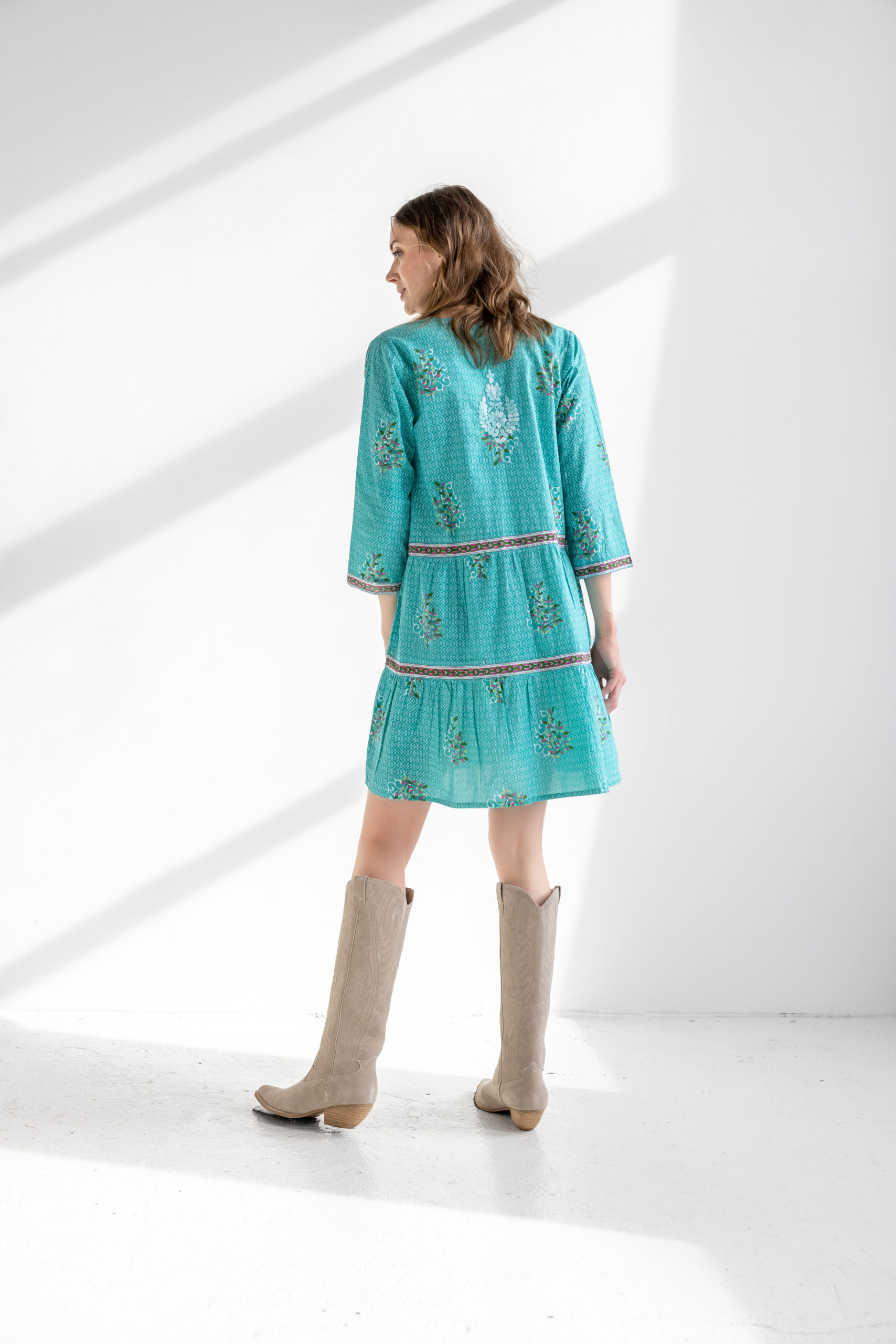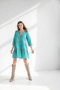 Wake up your wardrobe with this lively turquoise dress! An easy loose shape, comfortable with boots or sandals.