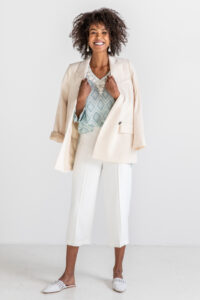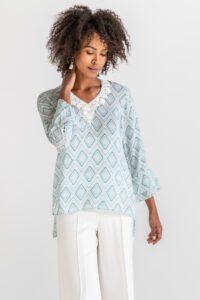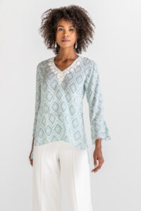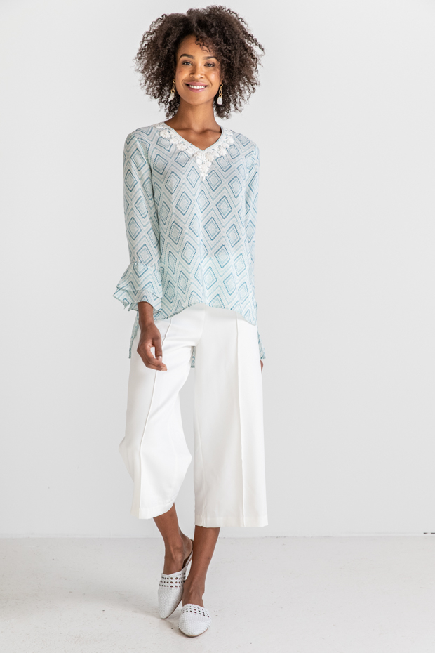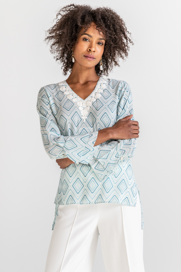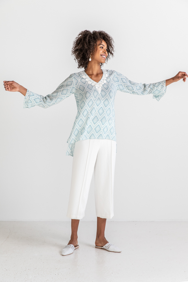 A nonchalant fit with double flutter sleeves defines this tunic top that is easy to dress up or down. This silk piece has a flattering neckline, hand embroidery and a longer hemline in the back.