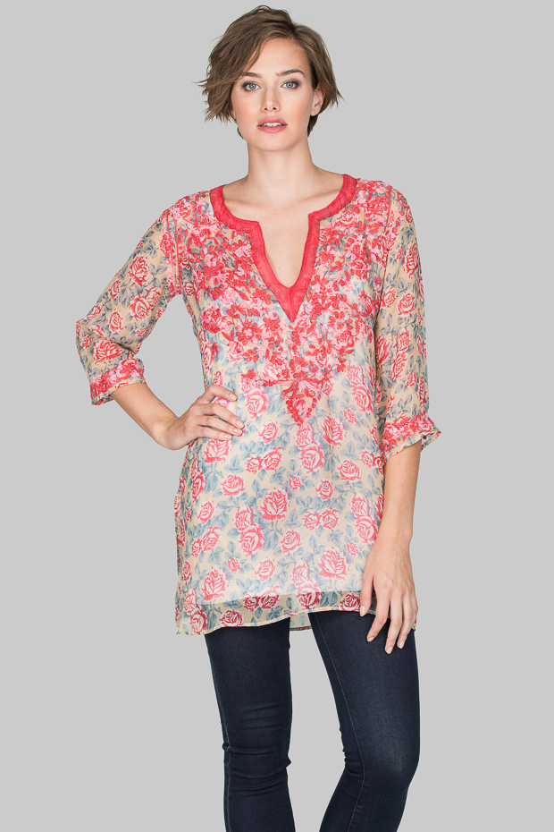 This beautiful silk tunic features striking hand embroidery around the split neckline and cuffs. It pairs beautifully with skinny jeans or leggings.
