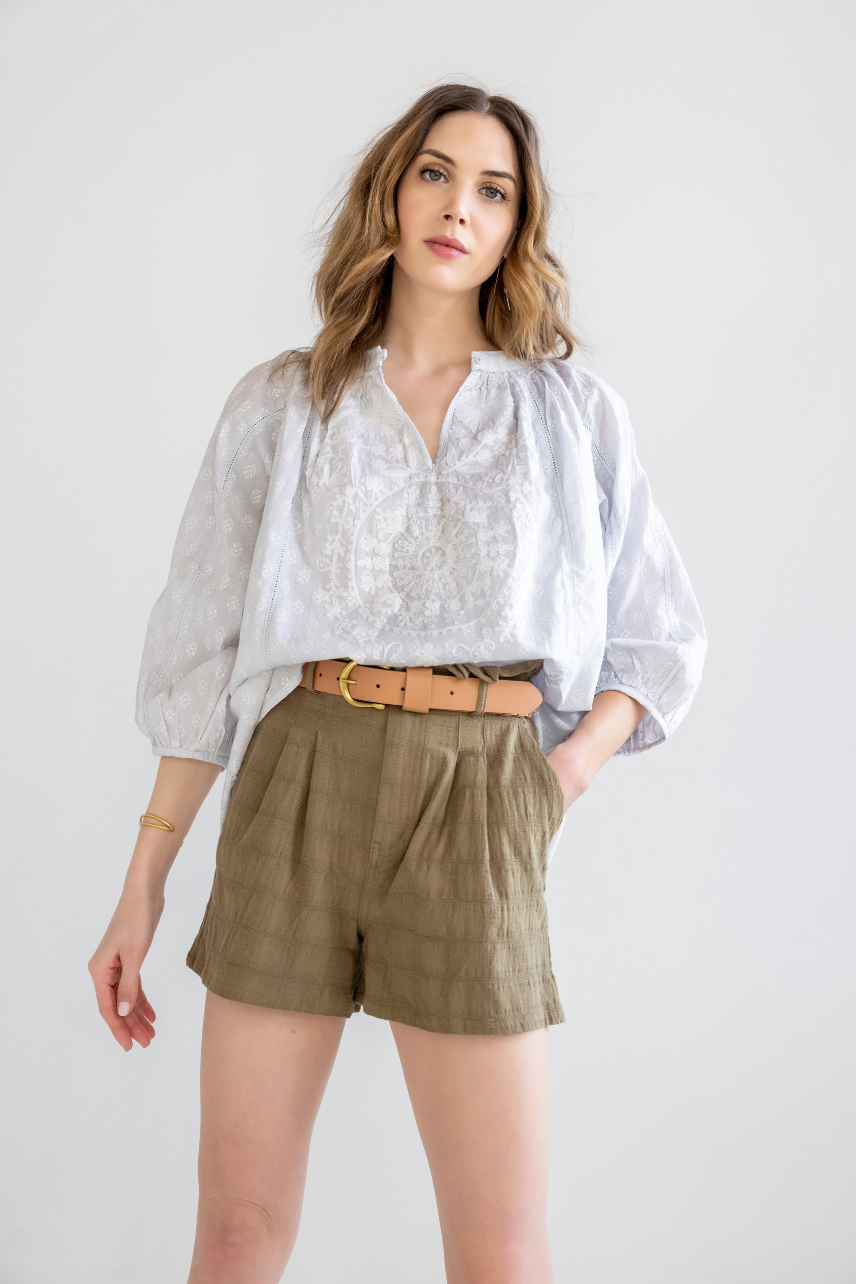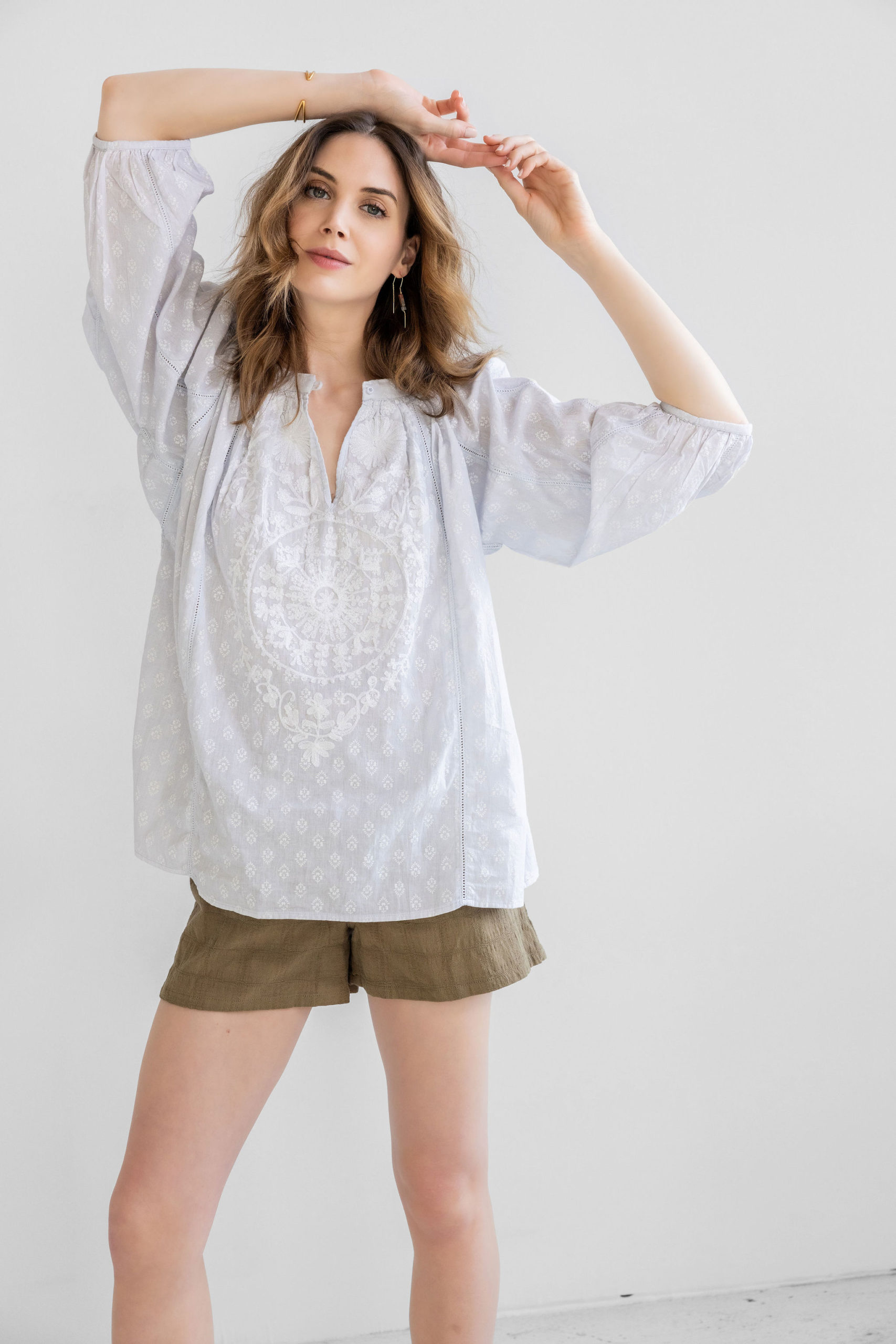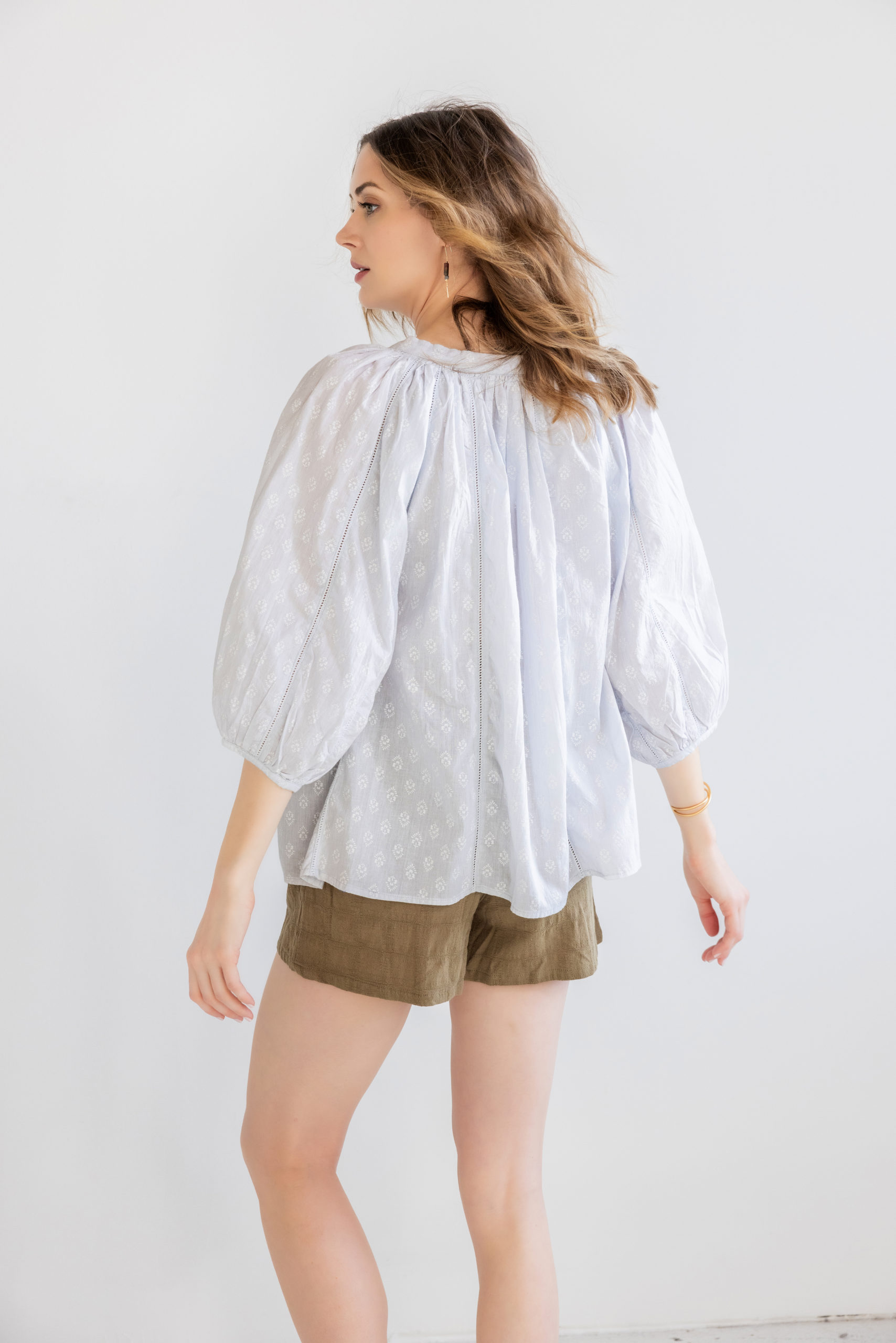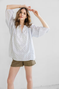 Riley is our new version of the Eliza, a favorite. This soft arctic blue cotton is casual and comfortable to wear with jeans, shorts or white pants. The button front opening, balloon sleeves and loose fit are easy to slip into any time.