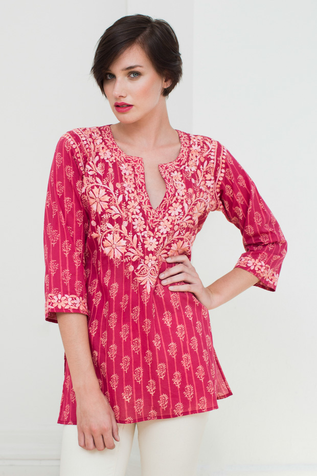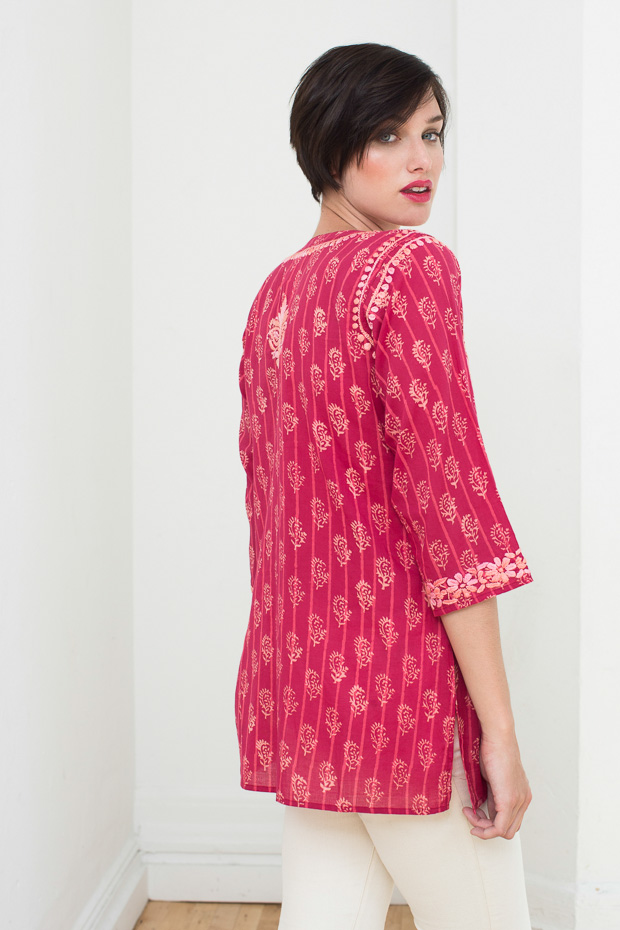 This eye-catching tunic in a soft shade of raspberry red features eye catching detailed hand embroidery. Made by hand using a block print. Pairs beautifully with your favorite pair of jeans.
