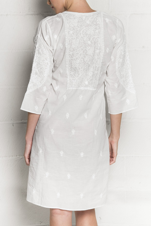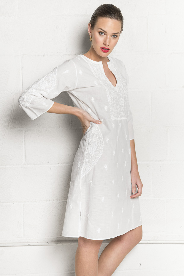 This cotton dress features a bib front with feminine details and beautiful hand embroidery. A perfect choice for a holiday at the beach or lounging at home.