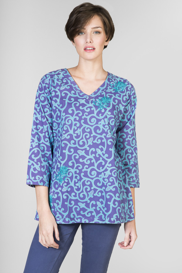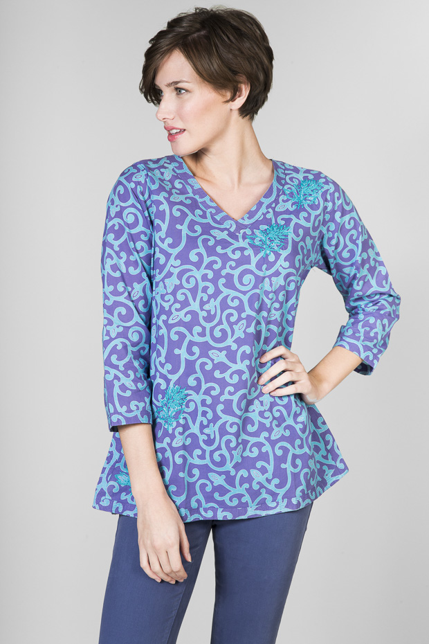 Enjoy this vibrant shirt any day. It’s made of lightweight cotton and fun to wear. Pair with your favorite jeans or white pants to make the colors pop. Hand embroidery enhances the colors and is the finishing touch.
