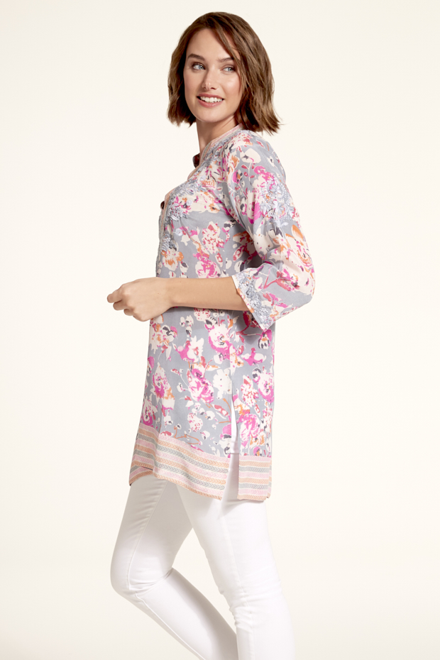 Effortless chic best describes this tunic. Made from luscious silk crepe with beautiful detailed embroidery and a contrasting border, it is the perfect travel piece.