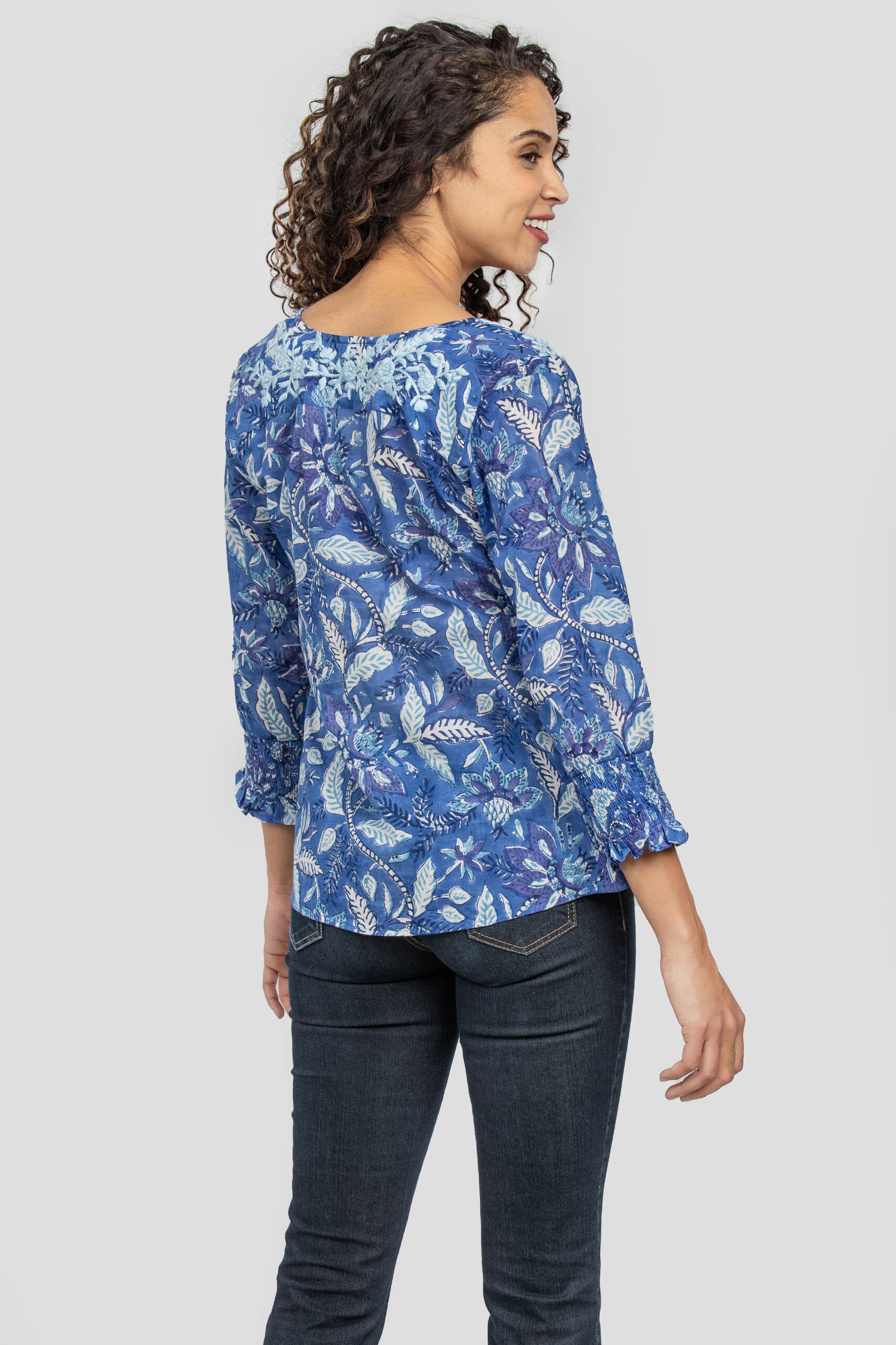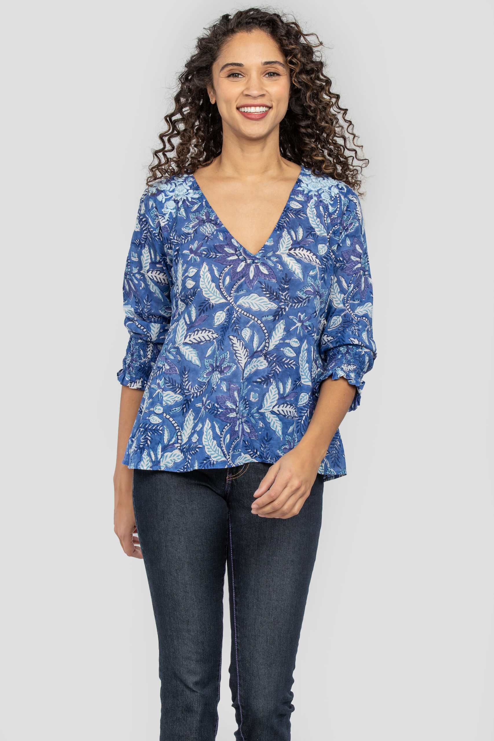 Zaya is a light as air hand block printed cotton with gathered sleeves and a feminine silhouette that sits perfectly at the hips. Teardrop earrings & tailored pants elevate the look for evening.